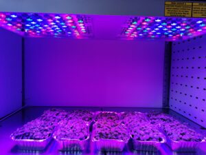 Benzi LED cu lungime de undă definită (în regiunile roșii și albastre, 430-660 nm) vor fi controlate folosind variatoare, permițând astfel modularea fotonică precisă a compozitiei luminii. - Testare inițială (TRL 3) – se va efectua cultivarea a 2 specii: Ocimum basilicum și Chenopodium quinoa . Se va cuantifica producția totală de compusi fenolici, pentru a valida performanța inițială – microplantulele se vor cultiva pe o perioada de 5-12 zile, in functie de specie si de viteza de germinare